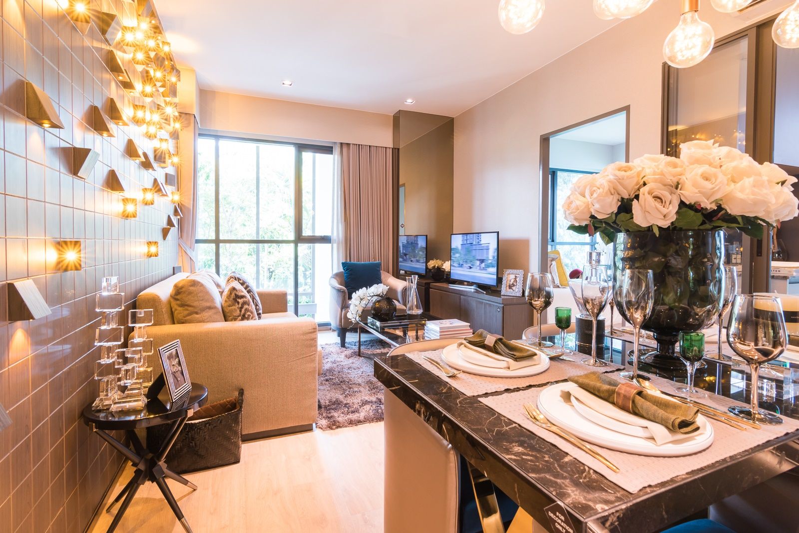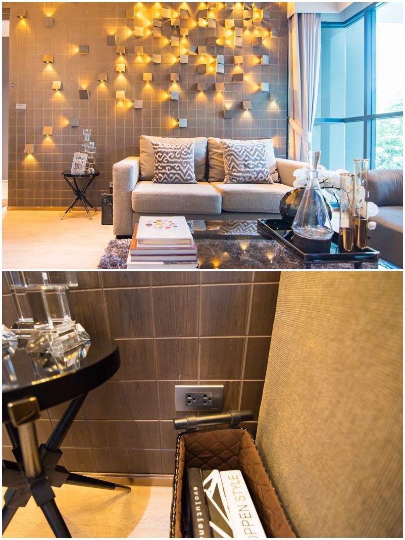 หากเทียบกับห้องครัวแล้ว ห้องนั่งเล่นจะดูเล็กกว่าเล็กน้อย เนื่องจากทางคอนโดตกแต่งด้วยเฟอร์นิเจอร์ค่อนข้างเยอะ เลยดูเต็มห้องไปหมด แนะนำให้วางโซฟาตัวเดียวก็พอ หรืออาจลดจำนวนเฟอร์นิเจอร์ลง แล้วเปลี่ยนมาใช้โซฟาแบบ Daybed แทน ก็จะทำให้ห้องดูกว้างขึ้น
