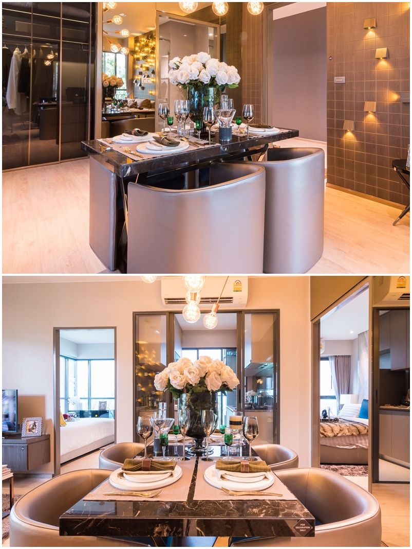 มุมทานข้าวเป็นส่วนแรกของห้องเอาใช้ต้อนรับแขก ซึ่งทาง Whizdom Station รัชดา-ท่าพระ ได้วางโต๊ะทานข้าวขนาดกลาง 4 คนนั่งตั้งให้ดูเป้นตัวอย่าง