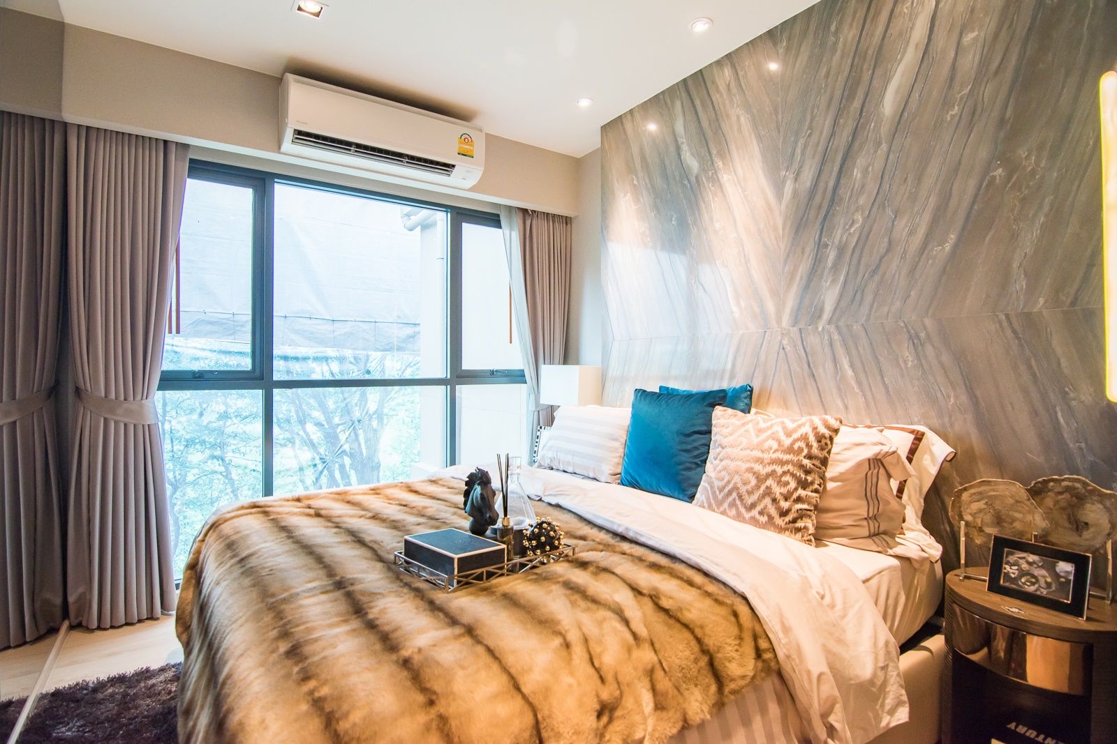 ริมห้องนอนเป็นหน้าต่างเปิดรับแสงจากนอกอาคาร ให้แสงธรรมชาติส่องเข้ามาได้เต็มที่ ด้านบนติดเครื่องปรับอากาศ Daikin