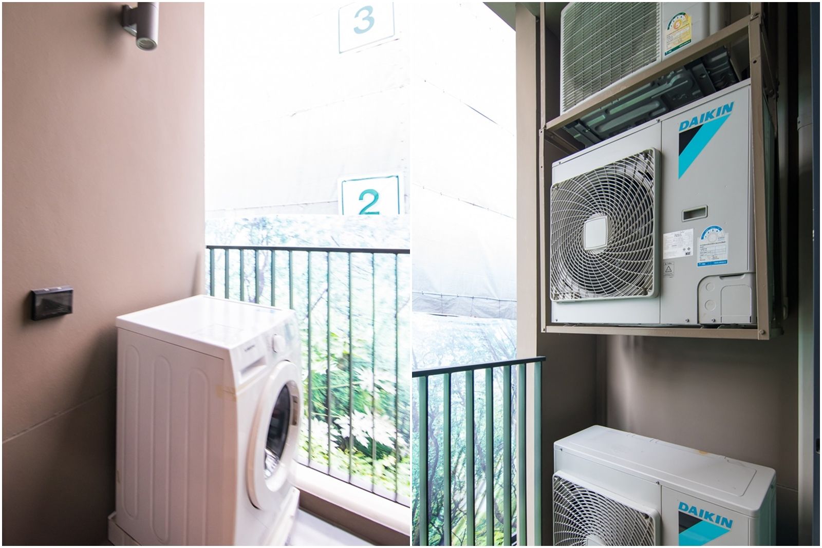 ด้านนอกแขวนคอมเพรสเซอร์ 2 ตัว วางพื้นอีก 1 ตัว ส่วนอีกฝั่งทางคอนโด whizdom รัชดาท่าพระ ตั้งเครื่องซักผ้าไว้เป้นตัวอย่าง สามารถเลือกใช้ได้ทั้งแบบฝาหน้าและฝาบน