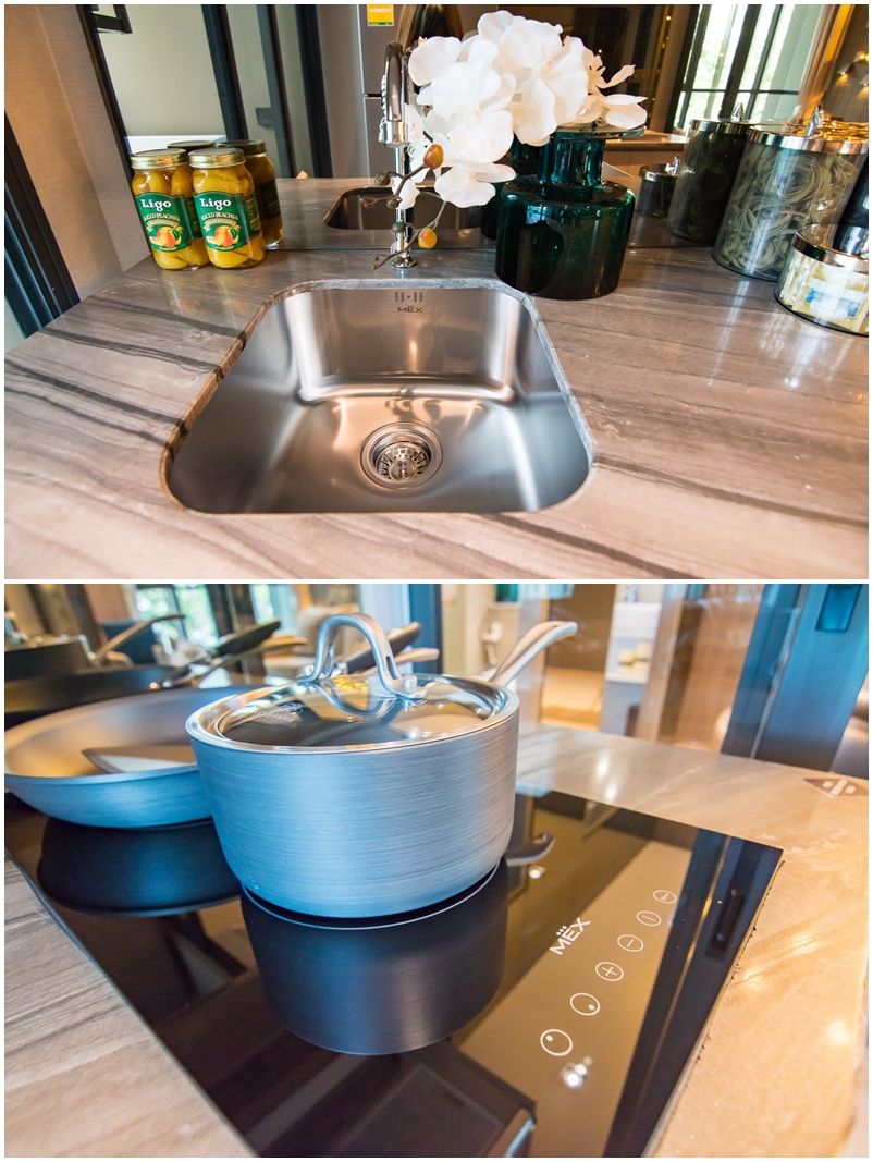 ซิงค์ล้างจานสแตนเลสก้นลึก เอาไว้ล้างหรือแช่ผักผลไม้สะดวก แต่ไม่มีที่พักจาน เวลาใช้งานเสร็จควรเช็ดพื้นที่รอบๆ ด้วย เตาไฟฟ้าของ MEX ขนาด 2 หัว
