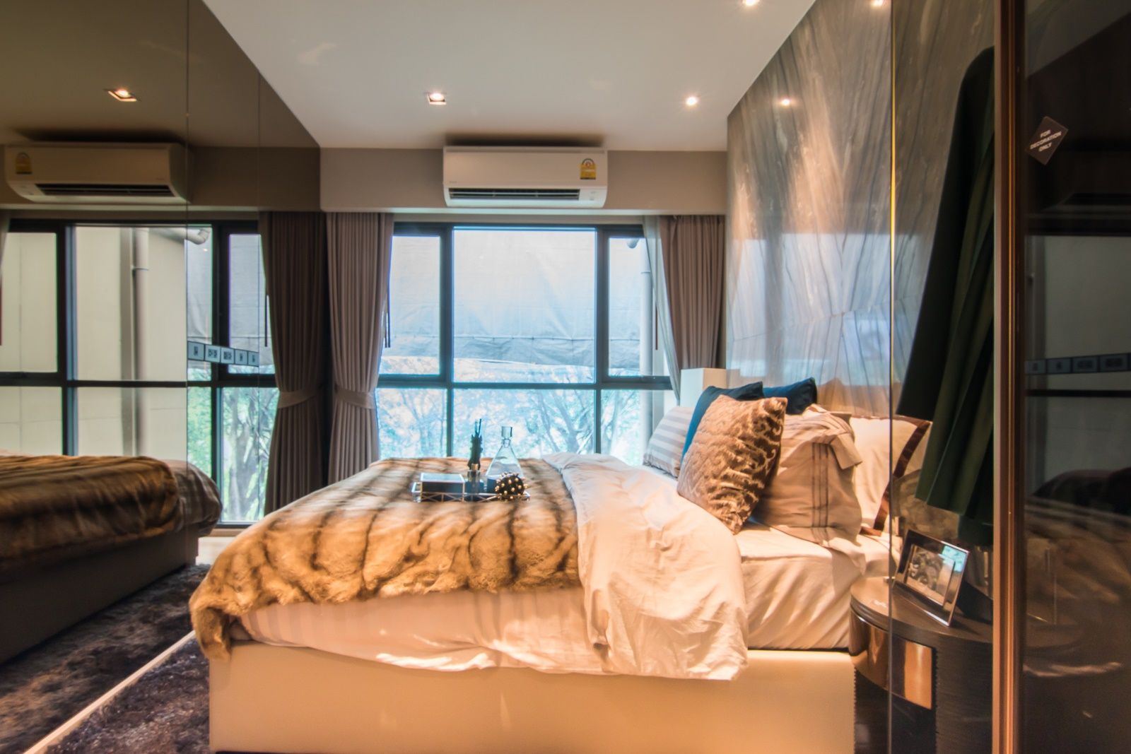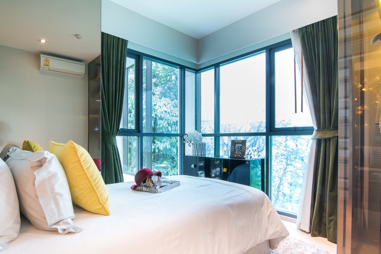 หน้าต่างกว้างตามผนังห้อง ทำให้ห้องดูปลอดโปร่ง ไม่อึดอัด ด้านบนติดเครื่องปรับอากาศของ Daikin