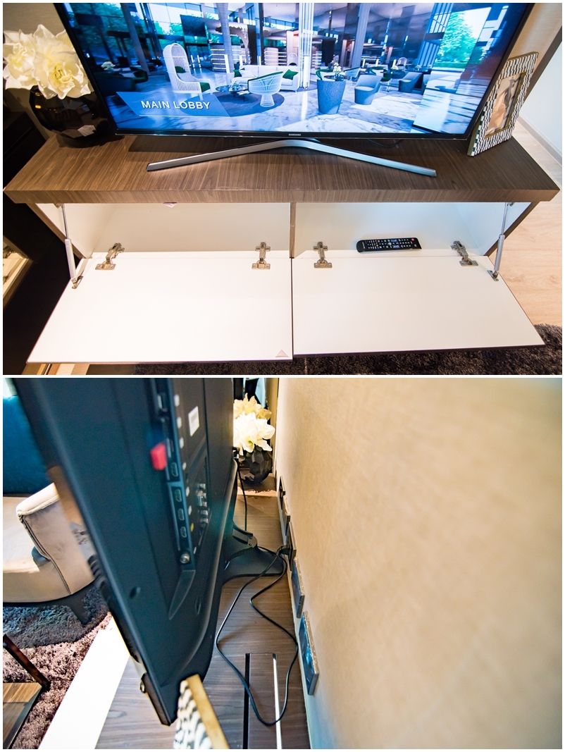 ชั้นวางโทรทัศน์ตรงข้ามโซฟา ทำเป็นชั้นล built in เพื่อช่วยประหยัดพื้นที่ห้องและใช้พื้นที่แนวตั้งให้คุ้มค่า หากต้องการติดตั้งโทรทัศน์แนะนำว่าให้ติดแบบแขวนผนังจะดีกว่า จะได้ไม่สิ้นเปลืองที่วางของ ส่วนด้านหลังทีวีมีปลั๊กไฟให้ 3 เต้า+ปลั๊กสัญญาณ 1 และปลั๊ก LAN อีก 1 เหมาะสำหรับคนชอบดูหนัง ต่อโฮมเทียเตอร์ได้สบาย