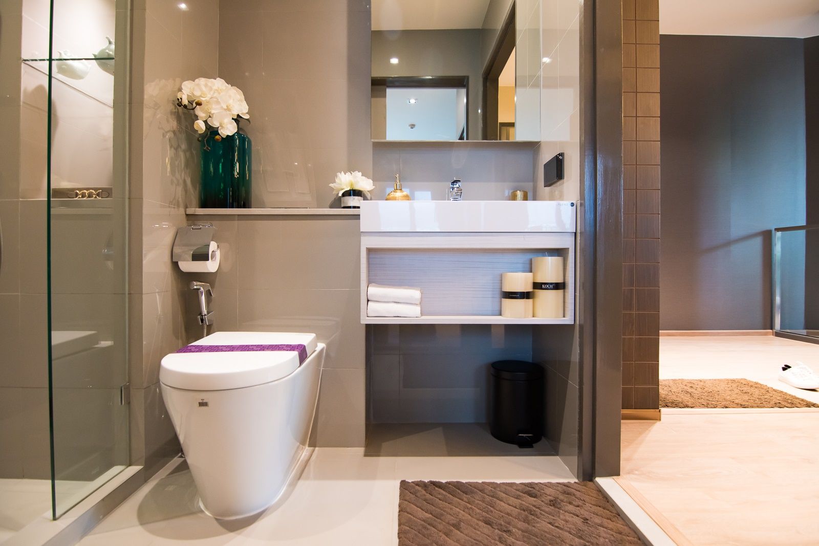 ห้องน้ำแยกโซนแห้งและเปียกให้ มีหน้าตาสุขภัณฑ์เหมือนกับ 2 ห้องที่ผ่านมาทุกอย่าง ต่างแค่มีทางเข้าออก 2 ทาง คือ จากห้อง Master Bedroom และ ห้องนั่งเล่น
