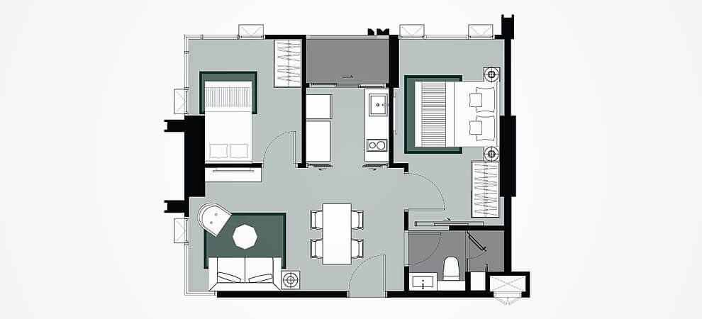 ห้อง Type D เป็นห้องแบบ 2 ห้องนอน ขนาดกำลังดีกับผู้อาศัย 2 คน หรือครอบครัวเล็กแบบ “พ่อแม่ลูก” เป็นห้องที่มีพื้นที่ส่วนรวม พื้นที่พักผ่อนอยู่ตรงกลางให้ผู้พักอาศัยได้ทำกิจกรรมร่วมกัน ส่วนพื้นที่ส่วนตัวจะแยกกันค่อนข้างชัดเจน มีความเป็นส่วนตัว และครอบครัวไหนที่มีลูกตัวเล็ก ก็จะรู้ได้ว่าลูกของเรากำลังทำอะไรอยู่ เพราะห้องน้ำมีแค่ห้องเดียวต้องแบ่งกันใช้ เวลาลูกมาเข้าห้องน้ำ พ่อแม่ก็จะรู้ได้ทันทีเพราะมีประตูเชื่อมกับห้อง Master Bedroom ด้วยทางหนึ่ง