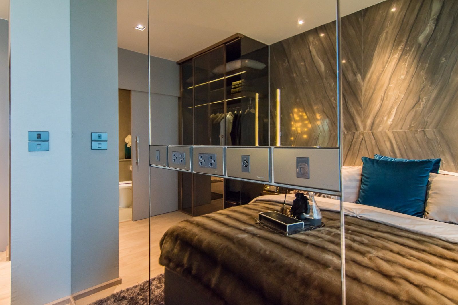ปลายเตียงมีปลั๊กสำหรับโทรทัศน์แบบแขวนผนัง และจะเห้นว่าทางคอนโด whizdom รัชดาท่าพระ ตกแต่งปลายเตียงด้วยกระจก ทำให้ห้องมีมิติ เป็นไอเดียแต่งห้องให้ห้องที่มีพื้นที่จำกัดดูกว้างขึ้น